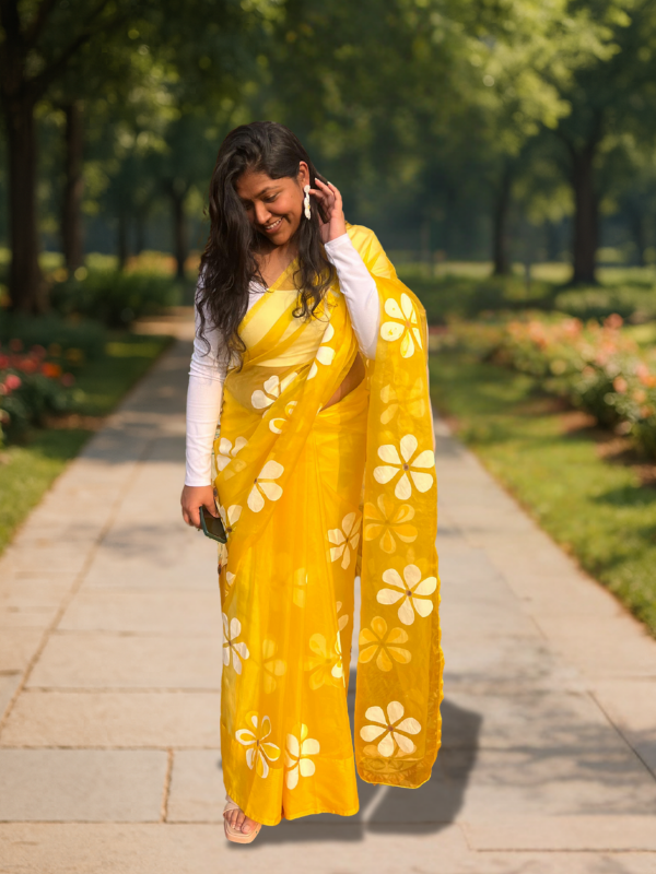 Embrace the beauty of handmade artistry with this exquisite handpainted organza saree. Carefully crafted with precision and care, this saree features a soft organza fabric that exudes luxury and refinement. The rich yellow hue serves as the perfect background for delicate white flowers, each hand-painted with meticulous attention to detail. This one-of-a-kind saree is truly a work of art that speaks to individuality, grace, and sophistication.