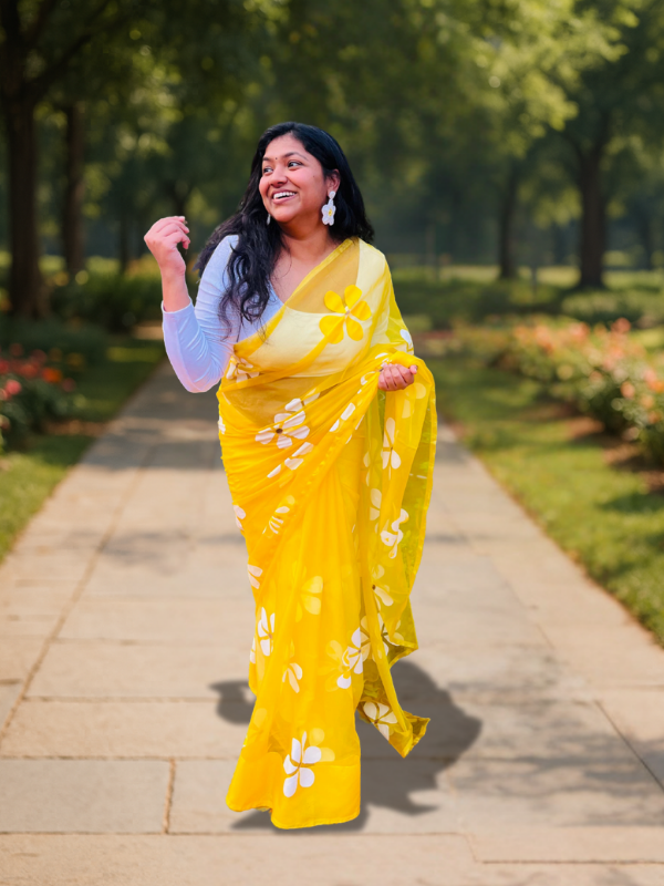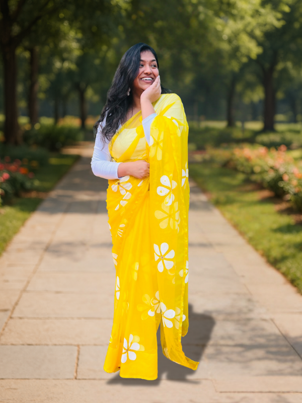 This yellow saree adorned with handpainted white flowers is custom-made to suit your unique taste. Its timeless design can complement a variety of styles and accessories, making it versatile for events ranging from festive celebrations to formal gatherings. Pair it with statement jewelry or subtle accents to enhance its stunning simplicity. Handmade with love, this saree showcases the artistry and uniqueness that you won’t find in mass-produced designs.
